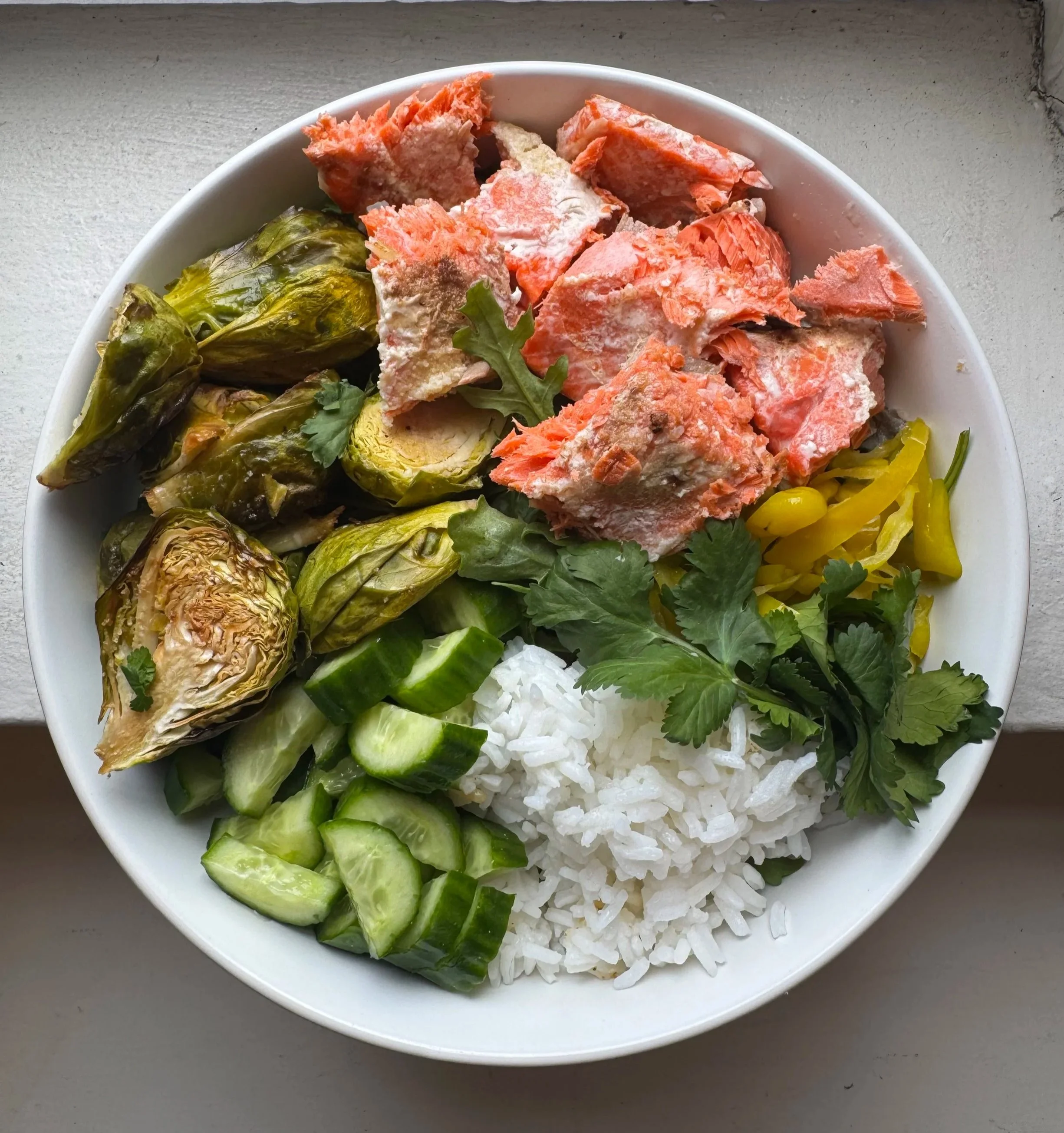 Top with salmon, Brussels sprouts, cucumber, pickled peppers, and herbs.