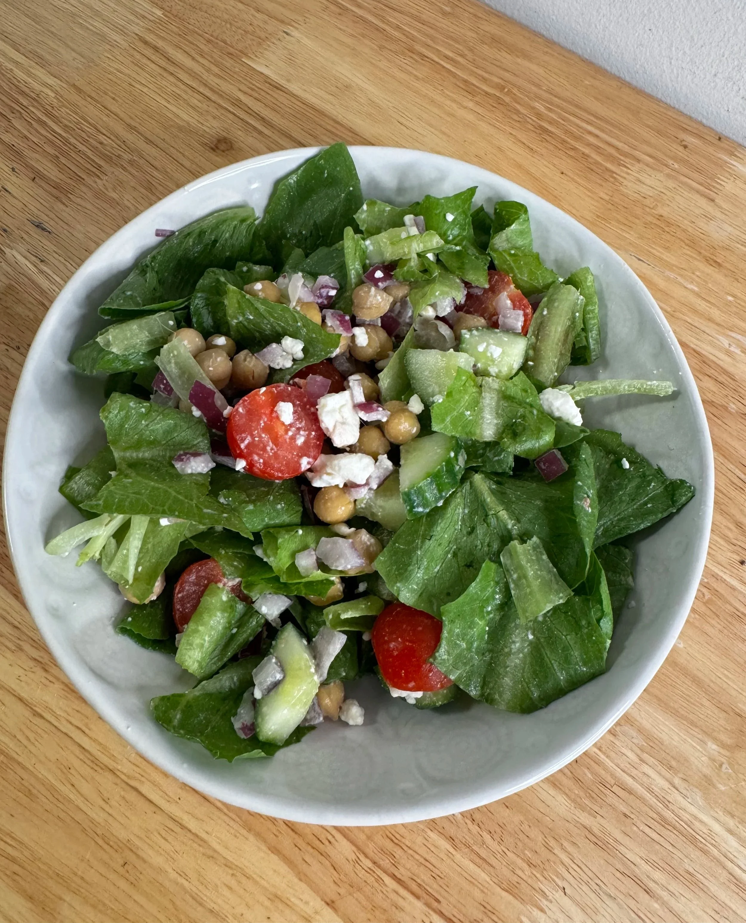 1. Add the romaine, chickpeas, feta, tomatoes, cucumber, and red onion to a large bowl.